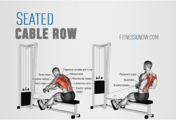 이 운동은 시티드 로우라는 운동으로 광배근,승모근,대원근,소원근,극하근,능형근,척추 기립근 다양하게 사용되는