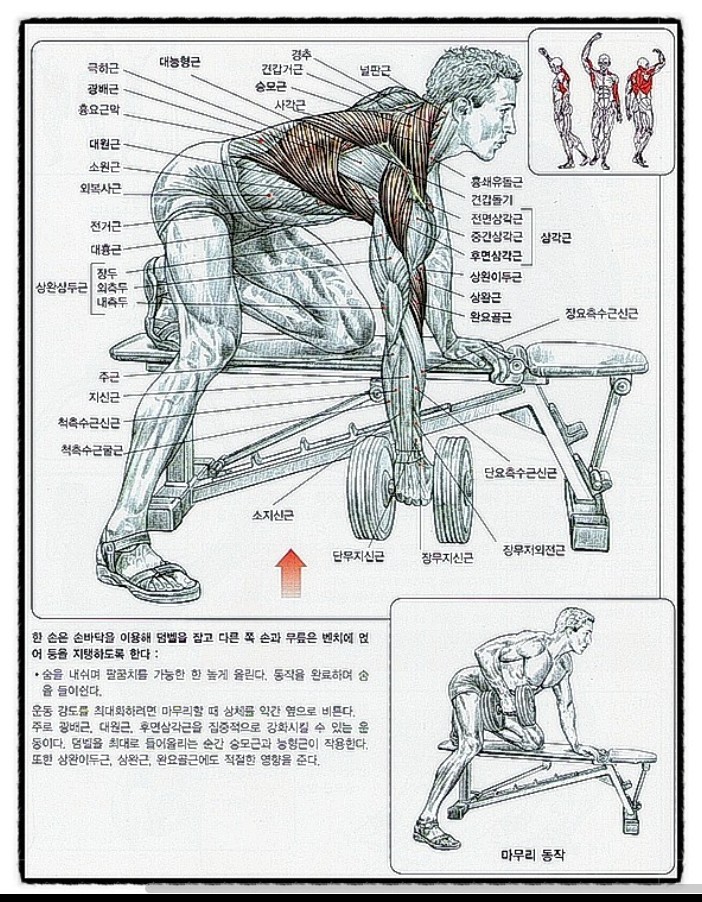 바벨로우를 수행했다면 이후로 덤벨로우를 통해 좀더 자극면에서 도움될수있기때문에 수행해주시면 좋습니다 좀더 바벨은 근력에 덤벨은 집중도에 많이들 신경써서 운동합니다 위 사진처럼 상체고정을위해 벤치에 무릎을 올려주고 한손으로 코어를 지지해준 상태에서 수행합니다 포인트는 덤벨을 들때 흉곽을 같이 들어주면 깊은 수축을 할수있습니다 이완지점도 바벨보다 더 늘려줄수있어 좋습니다 발끝을 사진과 같이 살짝 바깥쪽으로 돌려주어 고관절을 접어 엉덩이를 뺀 힙 힌지 가 중요합니다 하체가 잘 잡아주어야 등에서 고립할수 있기때문입니다